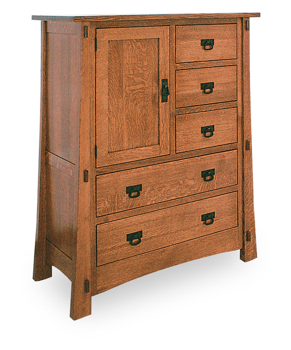 The Modesto 5-Drawer, 1-Door Chest offers a bold combination of enclosed and open storage in a classic Mission design. Handcrafted in the USA by skilled Amish craftsmen, this chest features five flush-front dovetailed drawers with full-extension slides and a solid wood door concealing one adjustable shelf. The exposed tenons, flared legs, and 1" thick square Mission top give this piece its distinctive character.