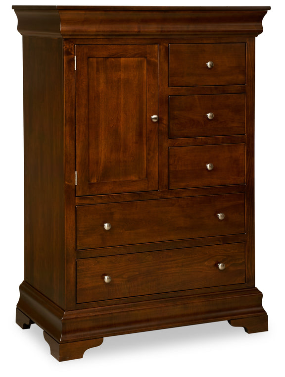 The Gentleman’s Chest (PV-1035) from the Palm Valley Collection combines commanding style with practical storage. Handcrafted in the USA by Amish builders, this stately piece features five dovetailed drawers with full-extension slides, plus a single door that opens to two adjustable shelves. An optional clothes rod is available, making this chest ideal for both clothing and linen storage.